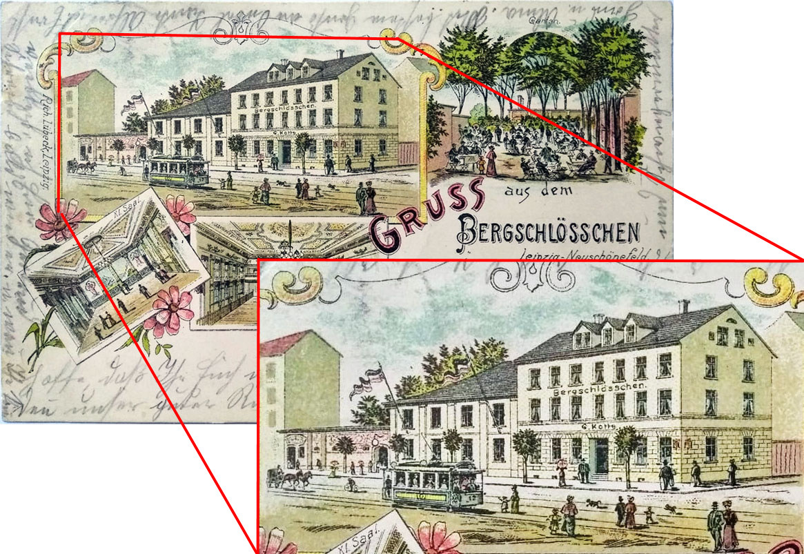 Auf der folgenden Ansichtskarte sind im großen Bild die Gebäude des Bergschlößchens an der Eisenbahnstraße mit einer elektrischen Straßenbahn zu sehen: rechts mit der Hausinschrift das Restaurantgebäude, links daneben der große Festsaal mit anschließender Gartenmauer und Eingang zur Kegelbahn. Rechts ein Blick in den Garten des Restaurants und unten die beiden Festsäle. Ich finde, auf dieser Ansichtskarte kann man auch das eingangs gezeigte Foto aus dem Jahr 1988 mit Gebäude der Broiler-Bar Ost erkennen, das Haus an der Ecke der Melchiorstraße.