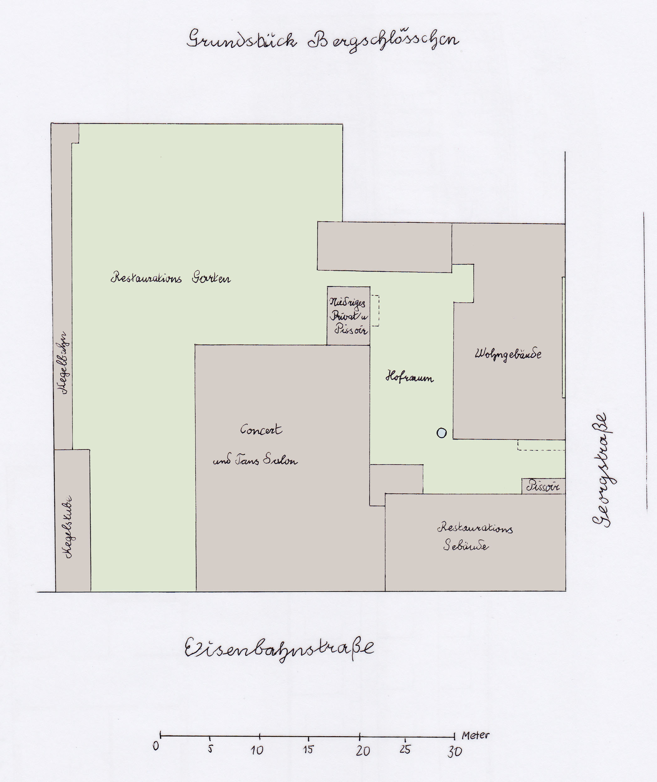 Zum Grundstück des Bergschlößchens gehörten inzwischen neben dem Concert- und Ball-Salon (Schlößchen) das Restaurationsgebäude, eine Wohngebäude (Georgstr. 1, später Melchiorstr. 1) und der Restaurationsgarten, siehe Lageskizze, Bild rechts.