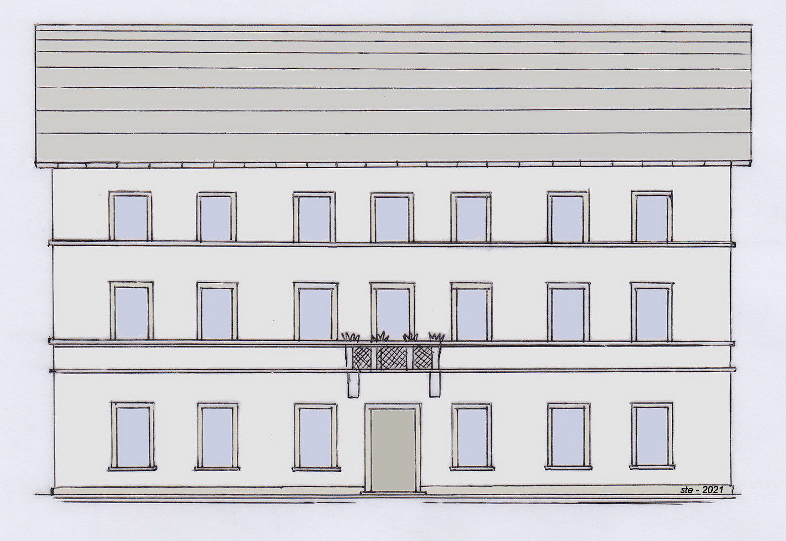 Sie zeigen links das projektierte dreigeschossige Wohnhaus mit Gaststube und rechts den Grundriss im Erdgeschossteil des Hauses ,mit der Fronte nach Norden, der Eisenbahn- oder Bergstraße zu gewendet‚, wie es im oben wiedergegebenen Schreiben heißt.