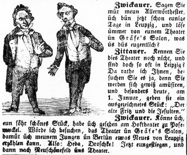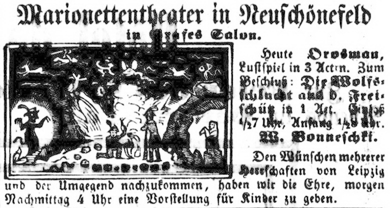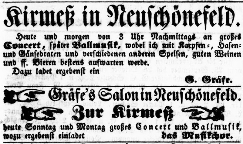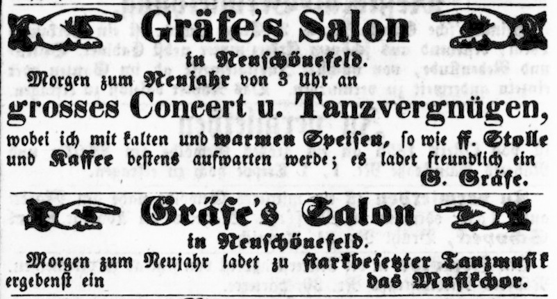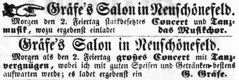 Johann Gottfried Gräfe war ein findiger Schankwirt und Organisator. Der Gasthof mit dem Salon-Anbau wurde außer für Concert und Tanz bald vielseitig genutzt. Auf der Bühne fanden so z.B. auch Theater- und Marionetten-Theater-Aufführungen statt. Zu den Standard-Feiertagen von Neujahr über Ostern, Reformationsfest, Weihnachten bis Silvester bot er den Einwohnern von Neuschönefeld und der ganzen Umgegend ein umfangreiches Programm. Hier anschließend in einer kleinen Dia-Schau ein paar Beispiele aus den Jahren 1852 bis 1858: