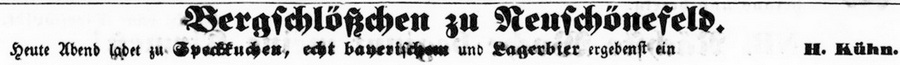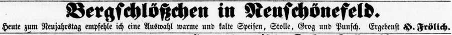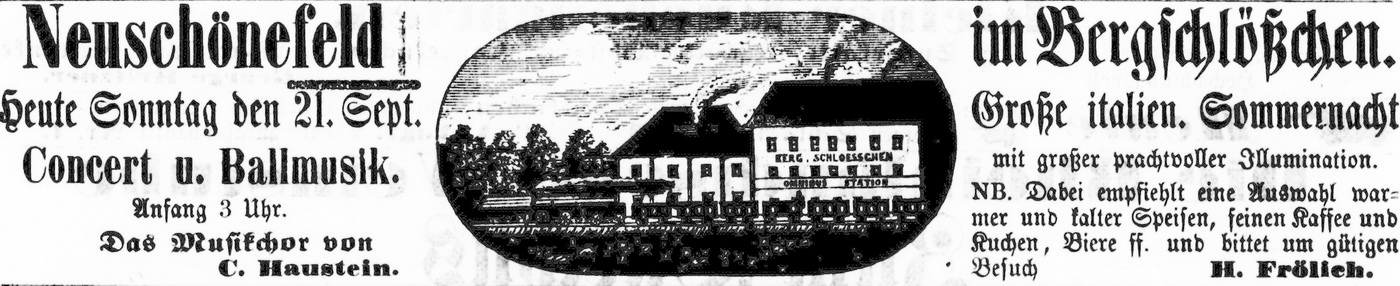 Interessant fand ich eine Anzeige aus dem Leipziger Tageblatt vom Januar 1875, in der zu einem Concert zum Besten einer Christbescherung für arme Kinder des ,,Neuen Anbaus“ zu Schönefeld [ab 1881 die selbständige Gemeinde Neustadt] in den Saal des Bergschlößchens eingeladen wird, Anzeige oben rechts.