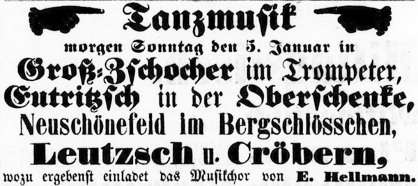 Auf der rechten Seite noch eine ansprechende Anzeige zum Bergschlößchen als einem Konzert- und Ball-Etablissement zu einem Auftritt der Krystall-Palast-Sänger, der ältesten und anerkannt besten Herrengesellschaft Leipzigs. Na, wenn das nichts war …