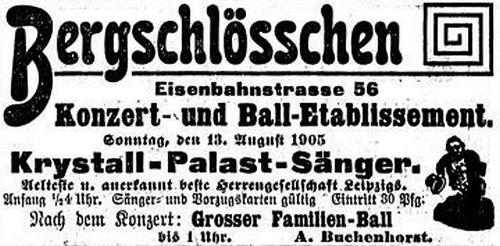 ,,Die erste Concession zur Schankwirthschaft erhielt Herr Gottfr. Gräfe provisorisch für das jetzt Herrn Uhrmacher Lehmann gehörige Haus in der Eisenbahnstraße, und kurze Zeit später ständig für das Grundstück Nr. 83, jetzt ,,Zum Berschlößchen“. Den ersten Tanzsaal erbaute der Zimmermeister Rübner (jetzt ,,Salon Sanssouci“), und wurde in ,,Rübners Salon“ am 27. Januar 1851 vor einer geladenen Gesellschaft, aus welcher der erste Verein, nämlich die ,,Harmonie“ hervorging, der erste Tanz aufgespielt. Im Mai desselben Jahres war der zweite, von Gottfr. Gräfe erbaute Saal ,,Zum Bergschlößchen“ fertiggestellt.“ [Quelle #2]