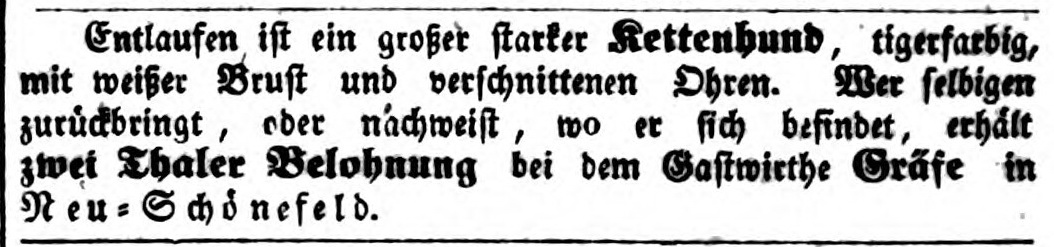 Einen ersten Beleg zum Gastwirth Gräfe habe ich einer Leipziger Zeitung vom 20. April 1847 entdeckt, siehe Ausschnitt rechts. Einen großen starken Kettenhund zurückbringen – sicher kein einfaches Unterfangen, da ist schon eine Belohnung erforderlich … 😉