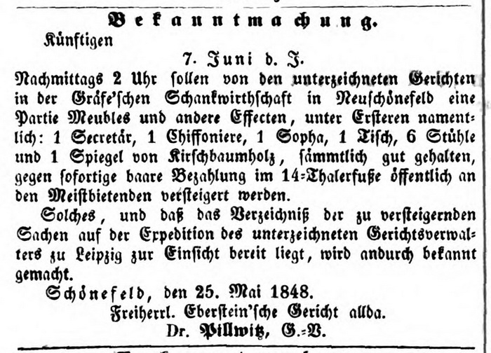 In den folgenden Jahren etabliert sich diese Schankwirtschaft in Neuschönefeld. Daher wurden dort auch zunehmend Aushänge von Grundstücksversteigerungen (Subhastationen) in der Gräfe’schen Schankwirthschaft öffentlich zur Kenntnis gebracht und wie man sehen kann, auch Versteigerungen von Möbeln durchgeführt, hier zwei Beispiele:
