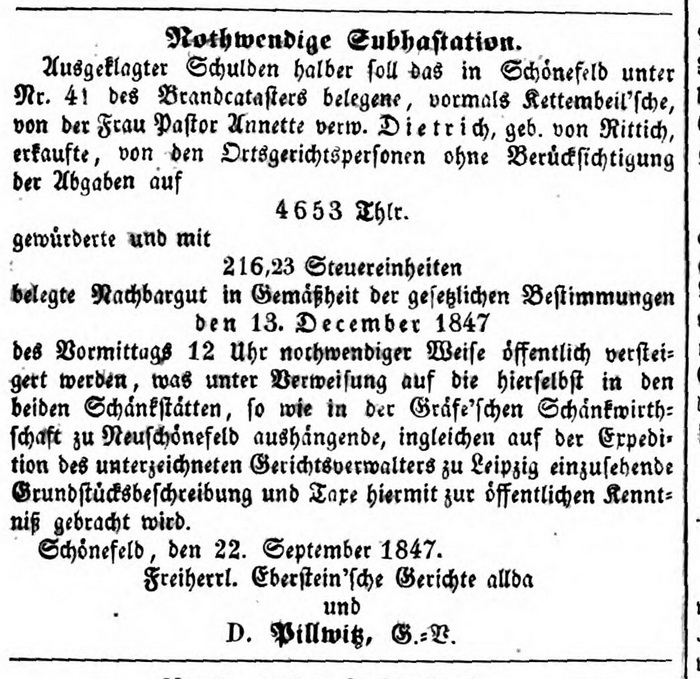 Nachdem der von der königl. hohen Kreisdirekion zu Leipzig für das Dorf Neuschönefeld als Schänkwirth concesionirte Fleischhauermeister