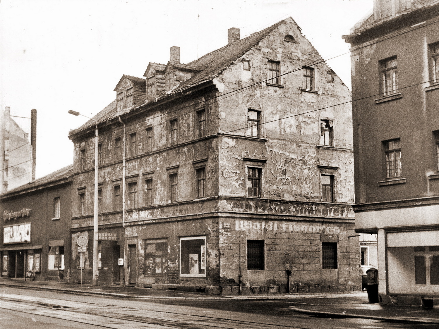 Das Bild links habe ich an einem kühlen und nassen Herbsttag im Jahr 1988 aufgenommen. Da ist zwar nicht viel los, aber man kann das ganze (ruinöse) Eckgebäude mit der Broiler-Bar gut sehen – das frühere Bergschlößchen. Auf der linken Seite ist der Eingangsbereich vom Kino Wintergarten zu sehen und rechts daneben der im Eingangsbild gezeigte Hausabschnitt mit dem früheren Kneipeneingang. Rechts daneben die Broiler-Bar Ost und die Straßeneinmündung stammt von der heute nicht mehr vorhandene Melchiorstraße (siehe auch Straßenschild an der Häuserecke). Alle diese Gebäude gibt es heute nicht mehr, sie wurden in den 1990er Jahren abgerissen.