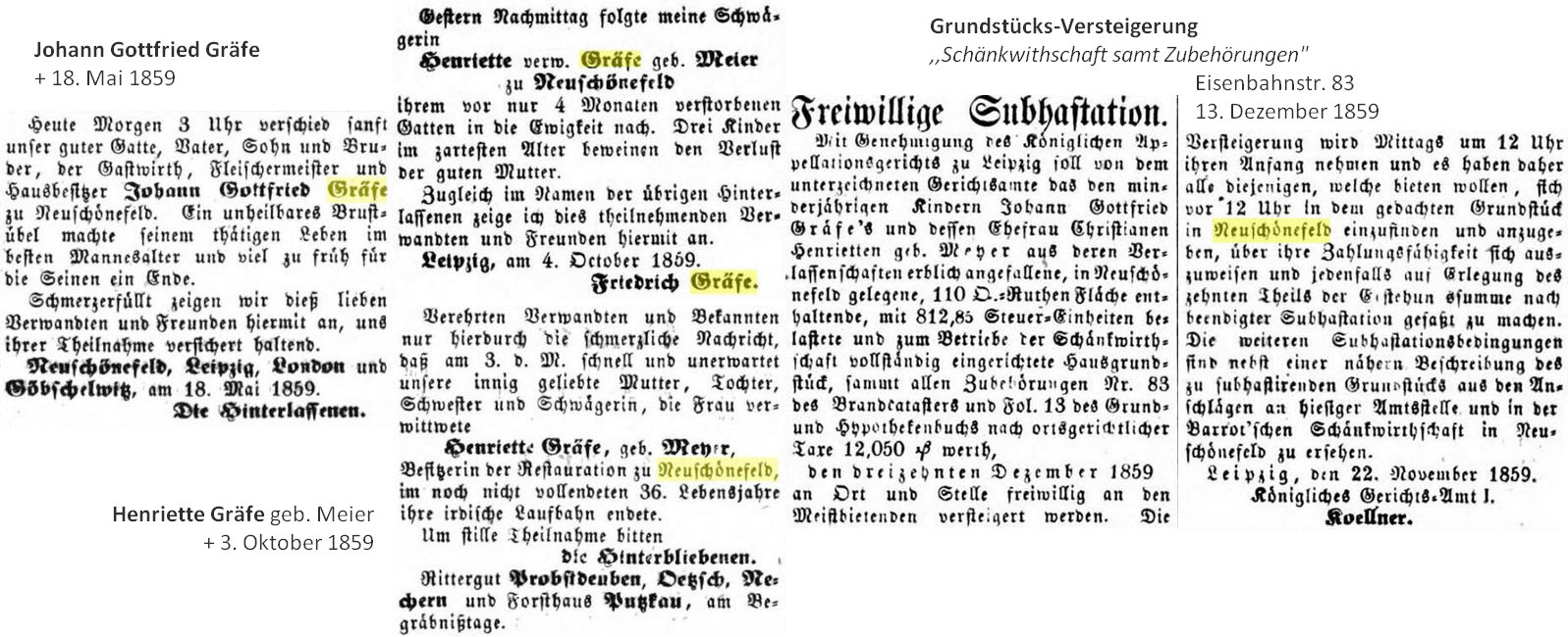 Doch im Jahr 1859 sollte sich das dramatisch ändern. Zuerst verstarb am 18. Mai der Besitzer Johann Gottfried Gräfe, im besten Alter, wie es hieß und knapp vier Monate später verstarb auch seine Frau Henriette, die inzwischen den Gasthof übernommen hatte, siehe Ausschnitte aus Leipziger Zeitungen des Jahres 1859: