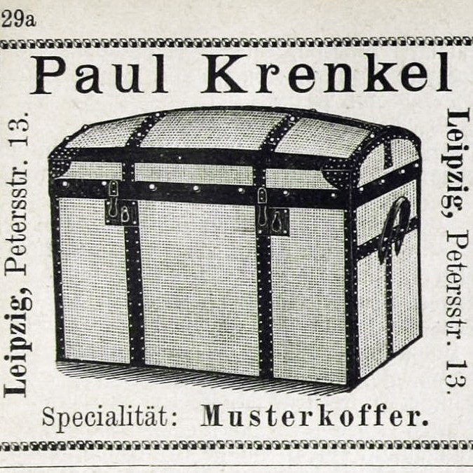 Bereits zwei Jahre später ändern sich der Firmenname in Krenkel und Huscher, der Firmensitz befindet sich im Peterssteinweg und im Firmenportfolio taucht mit der Bezeichnung Reise- und Muster-Koffer-Fabrik erstmalig der Begriff der Kofferfabrik auf. Im Adressbuch des Jahres 1883 werden nur noch der Kofferfabrikant Paul Krenkel und ab 1884 als Geschäftsanschrift die Leipziger Petersstraße (verschiedene Hausnummern) genannt. [Quelle #1]