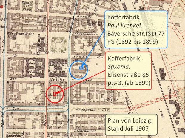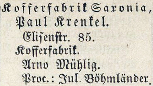 Die Kofferfabrik Saxonia Julius Böhmländer war in der Elisenstraße 85 bis zur Löschung im Handelsregister am 21. November 1930 nachweisbar.