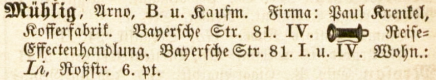 Wie nebenstehender Eintrag im Adressbuch zeigt, wurde die Fabrik auch in den folgenden zehn Jahren vom neuen Eigentümer unter dem bewährten Namen Kofferfabrik Paul Krenkel fortgeführt. Die Fabrik hatte sich bis zum Jahr 1895 auf zwei Etagen in der Bayerschen Str. 81 vergrößert, betrieb eine eigene Dampfmaschine mit 3 PS und beschäftigte inzwischen 17 Arbeiter. [Quelle #8]