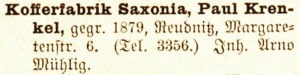 Wie man den Firmenakten entnehmen kann, wurde ab Juni 1903 als Vertreter von Arno Mühlig und Prokurist der Kaufmann Julius Böhmländer eingestellt und ab dem 22. Juli 1903 wurde der Namen der Firma in Kofferfabrik Saxonia Paul Krenkel geändert. [Quelle #7]