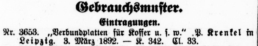 Der Kofferfabrikant Paul Krenkel hat sich in den 1880er und zu Beginn der 1890er Jahre auch mit neuen Ideen zu anspruchsvolleren, leichten und trotzdem stabilen Koffermaterialien und neuen Anwendungen beschäftigt, wie nachfolgende Gebrauchsmuster- und Patentanmeldungen zeigen: