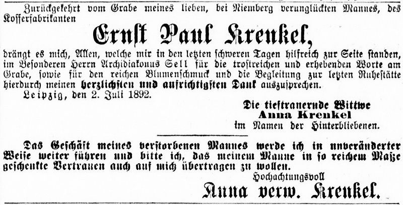 Quelle #6: Leipziger Tageblatt und Anzeiger, 28. Juni 1892 (Abendausgabe), Seite 5 und vom 3. Juli 1892, Seite 24, Unglück und Anzeige Anna Krenkel
