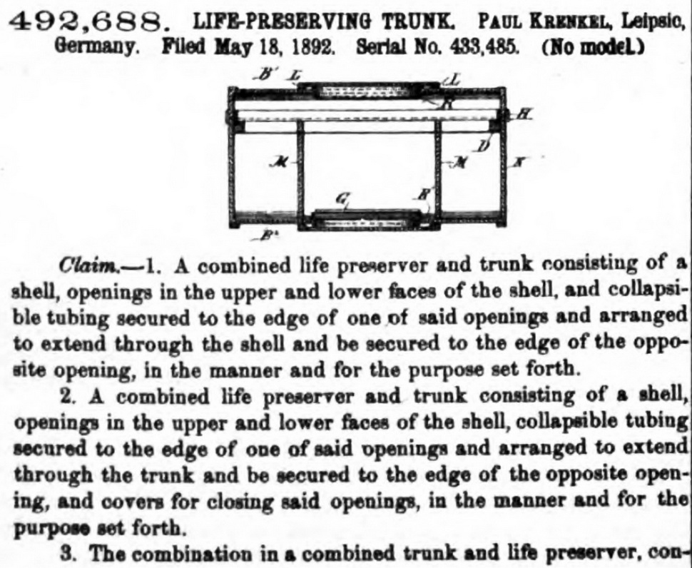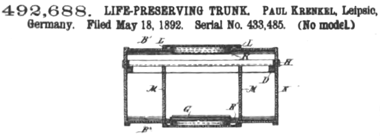 Quelle #4: aus Official Gazette of the United States Patent Office, Band 62, March 28, 1893, S.1314, 492,688 Paul Krenkel – Life-Preserving Trunk (May 18, 1892), darin heißt es: