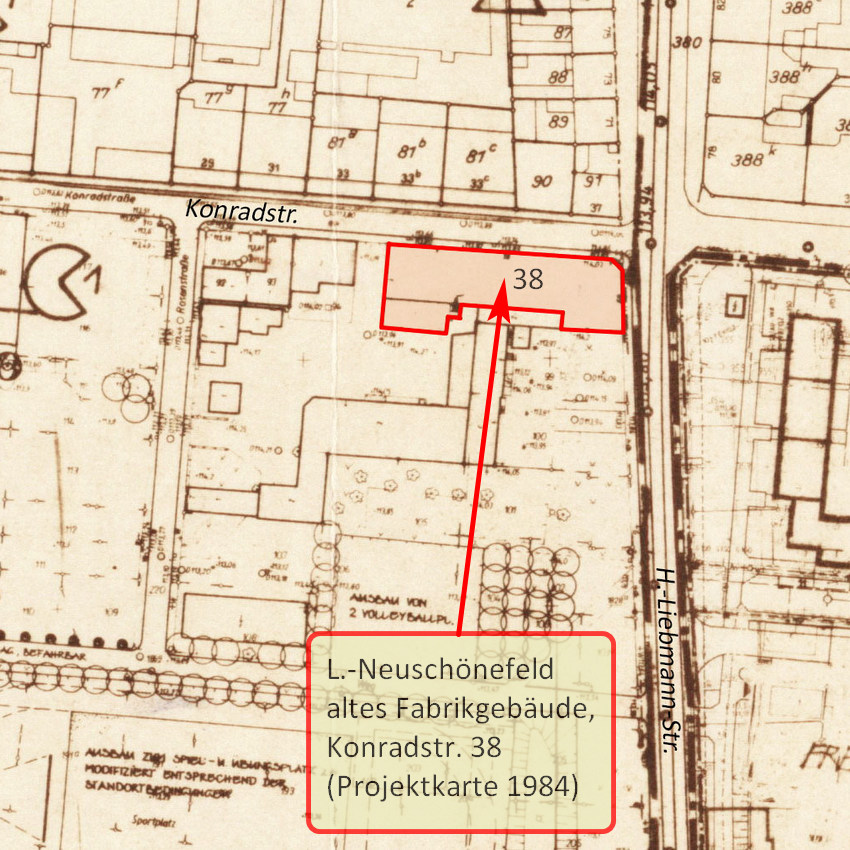 Rechts habe ich das alte Fabrikgebäude auf dem Ausschnitt einer Projektkarte aus dem Büro des Leipziger Chefarchitekten aus dem Jahr 1984 markiert. Damals wurde dieses Gebäude noch unter der früheren Adresse Konradstr. 38 geführt. [Quelle #3]
