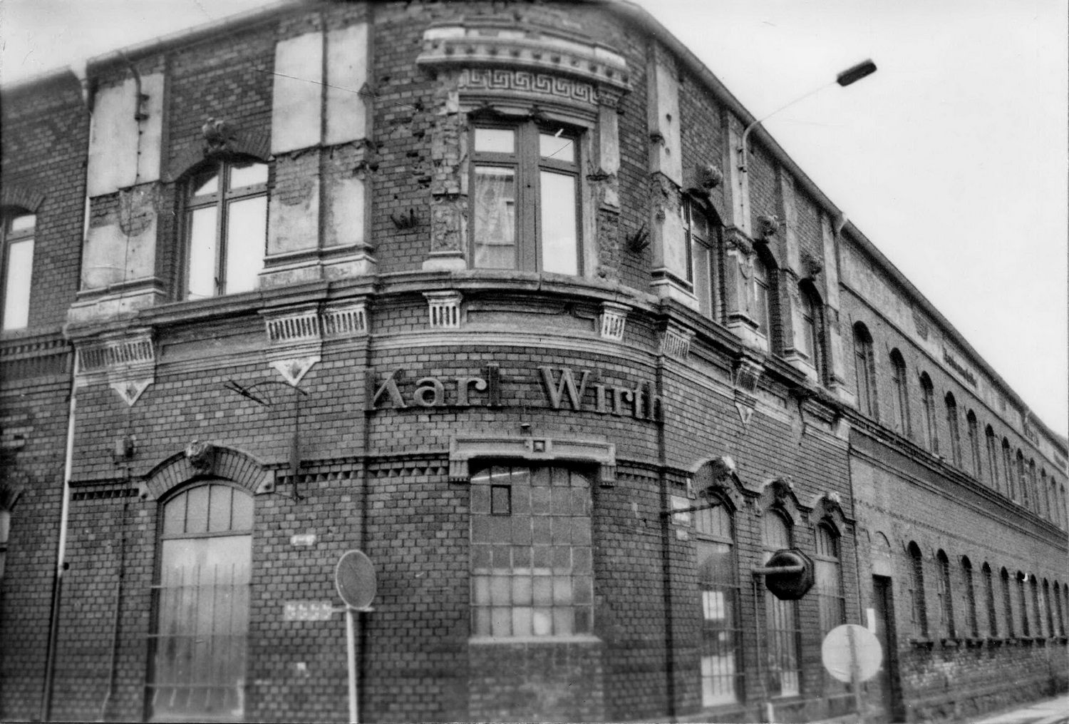 – links: noch mit der alten Eck-Beschriftung ,,Karl Wirth“ (mit ,,K“ geschrieben) und dem längerem anschließenden Seitengebäude mit vielen Fenstern (12 auf dem Bild) in der Konradstraße, etwa um das Jahr 1985,