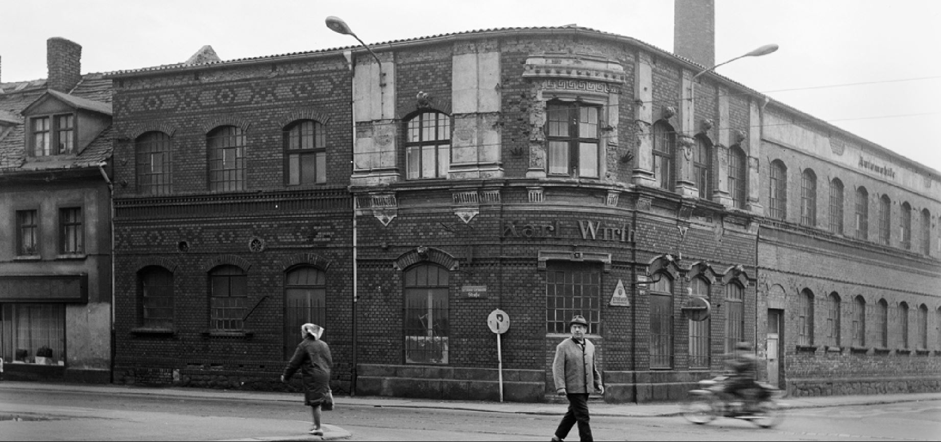 Auf dem rechten Bild ist die Gaststätte ,,Helgoland“ zu sehen, die früher auf der dem Fabrikgebäude gegenüberliegenden Straßenecke der Konrad-/ Kirchstraße, auf der Volkmarsdorfer Straßenseite, stand. Bemerkenswert ist das Gebäude am rechten Bildrand – das ist ein Teil des heutigen, denkmalgeschützten Fabrikgebäudes, der sogenannten ,,Alten Wagenhalle„. Damals noch als dreigeschossiges Gebäude zu erkennen!