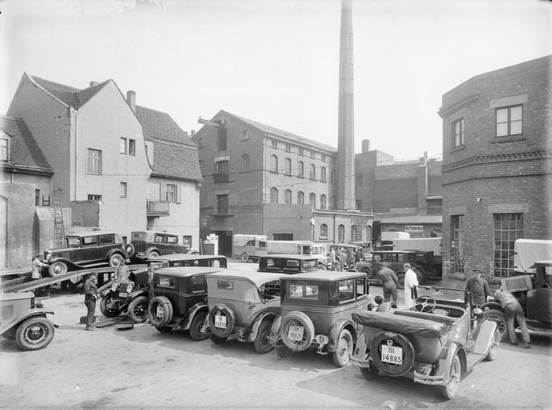 Auf dem folgenden Bild links ist der Innenhof der Firma Karl Wirth – Automobile zum Anfang der 1930er Jahre zu sehen. Hinter den Gebäuden in der Bildmitte verläuft die Konradstraße und rechts ist das dreigeschossige Fabrikgebäude zu sehen, um dessen Untergeschosse es im heutigen Beitrag geht.