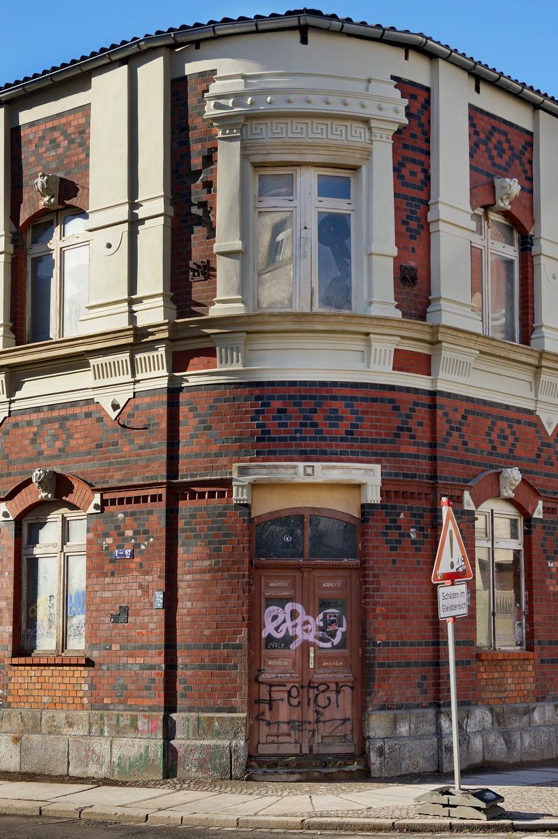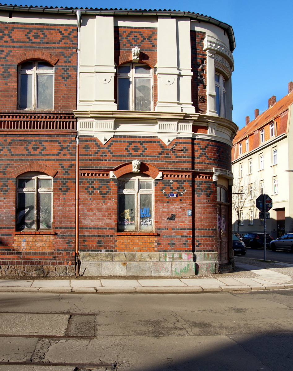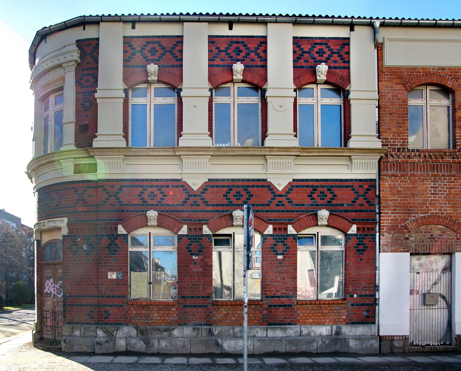 Ich bin dabei, beginnend von der Annäherung über die Konradstraße von Osten (Volkmarsdorfer Seite) entgegengesetzt zur Uhrzeigerrichtung um die beiden Gebäudeteile herumgelaufen. Achtet bitte mal auf Stuckelemente, Klinkermusterungen und Beschädigungen im Mauerwerk.