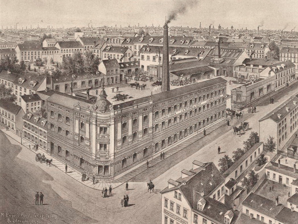 In einem Buch über die Die Groß-Industrie des Königreichs Sachsen aus dem Jahr 1892 habe ich das folgende Bild rechts) vom Firmengelände Schöne & Sohn entnommen. Es zeigt einen Blick aus der Vogelperspektive von der Kreuzung Konrad-/ Kirchstraße auf die Straßenecke mit dem dreigeschossigen Fabrikgebäude, das hier sogar mit einem Türmchen abgebildet ist. Zur Erläuterung: nach links verläuft die Kirchstraße [heute Liebmannstr.] und nach rechts die Konradstraße.