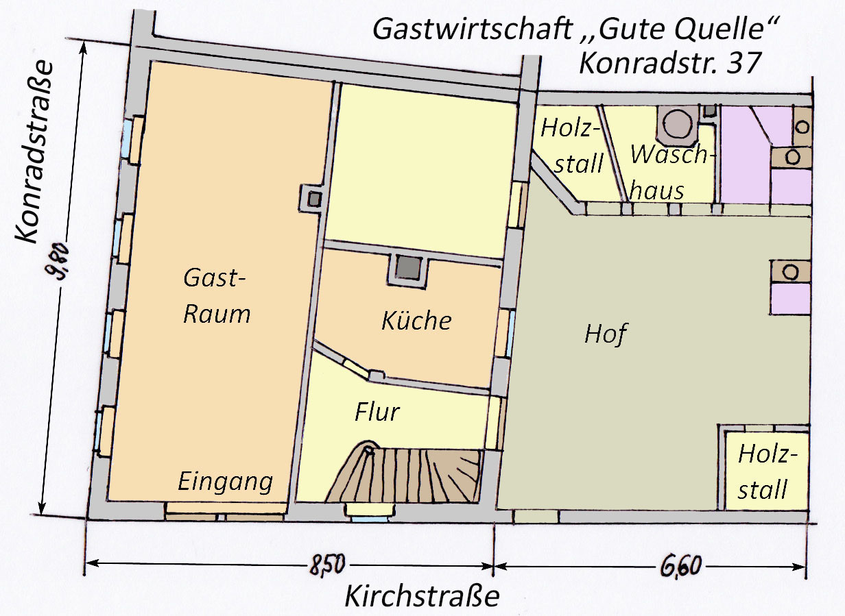 Zum Haus gehörte auch die kleine Gaststätte ,,Gute Quelle“ mit dem Eingang von der Kirchstraßen-Seite [heute: Hermann-Liebmann-Straße].