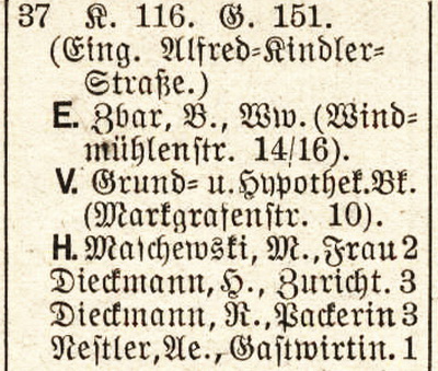 Die Witwe Babette Zbar wurde Mitinhaberin der Firma Opitz u. Co. , einer kleine Leihbibliothek in der Alexanderstr. 15, mit der sie sich und ihre beiden unmündigen 7 bzw. 11 Jahre jungen Kinder ernähren musste.