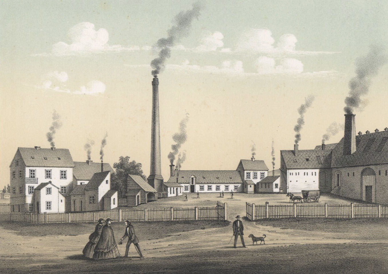 links das neu errichtete Wohnhaus an der Ecke zum Kirchweg, in Bildmitte die im Jahr 1857 errichtete Maschinenwerkstatt und auf der rechten Seite das neue Gießereigebäude aus dem Jahr 1860.