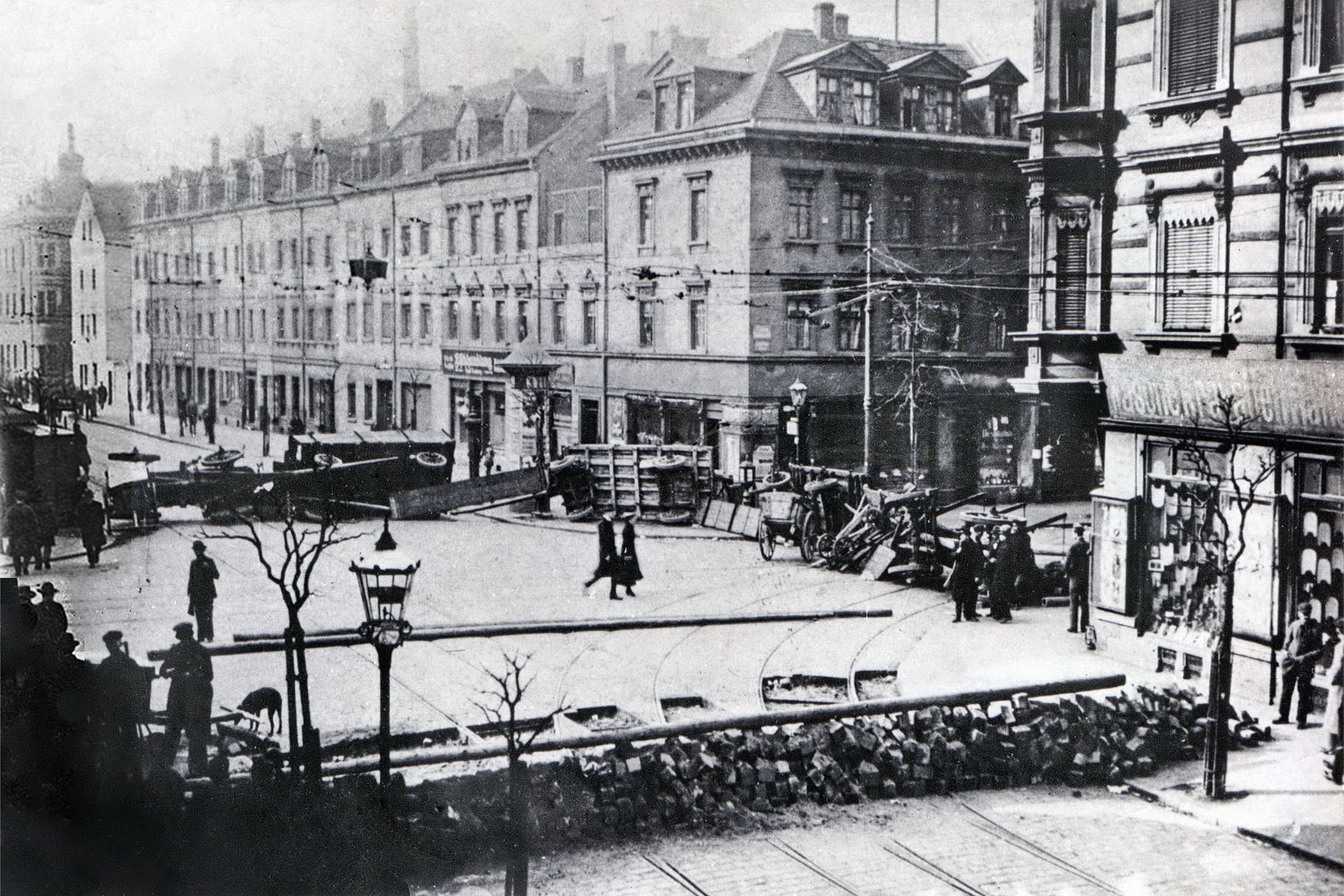 –> Anmerkung 3: habe ich aber noch parat, genauer gesagt geht es um eine interessante Ansichtskarte der Kreuzung Eisenbahn-/ Kirchstraße vom März 1920. Damals waren an dieser Straßenkreuzung beim Kapp-Putsch Barrikaden errichtet und ein Foto von der Volkmarsdorfer Seite der Kreuzung in Richtung Konradstraße aufgenommen worden. Und was ist dort am linken Bildrand zu erkennen? Ja, richtig – das ist das Eckgebäude Kirch-/ Konradstraße der früheren Firma J.G. Schöne & Sohn und mit Türmchen über der dritten Etage.