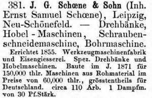 Quelle #7: Die Groß-Industrie des Königreichs Sachsen in Wort und Bild. Erster Theil, Eckert & Pflug, Kunstverlag, Leipzig 1892, Seiten S. 282/283 zur Firma J. G. Schöne & Sohn in Leipzig-Neuschönefeld, Maschinenfabrik und Eisengießerei