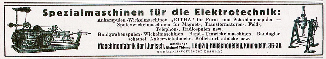 Wie aus einer Anzeige aus dem Journal Helios aus dem Jahr 1927 zu entnehmen ist, wurden hier in der Maschinenfabrik Karl Jurisch, Abteilung Richard Thieme, über mehrere Jahre Spezialmaschinen für die Elektrotechnik produziert.