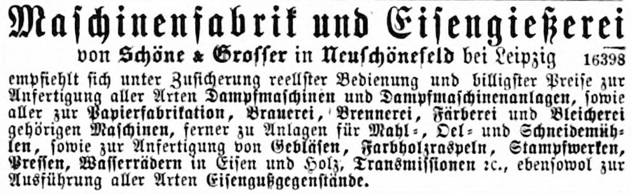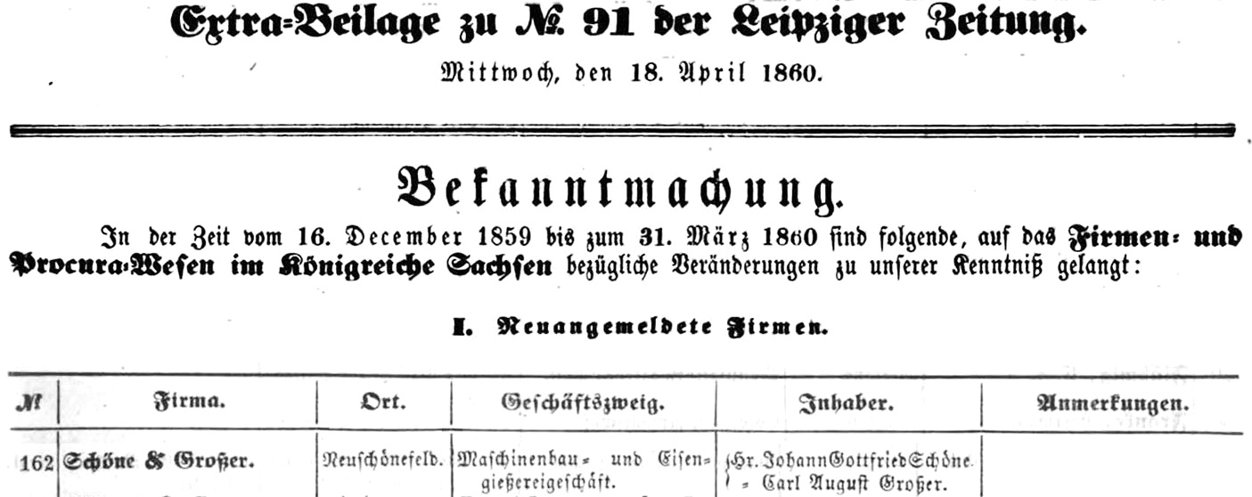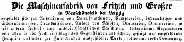 Demnach wurde als eines der ersten Erzeugnisse der neuen Firma Fritzsch & Großer noch Ende des Jahres 1857 eine firmeneigene Dampfmaschine gebaut. Eine erste Zeitungsanzeige zur neuen Neuschönefelder Firma habe ich der Leipziger Zeitung vom 26. Januar 1858 entdeckt:
