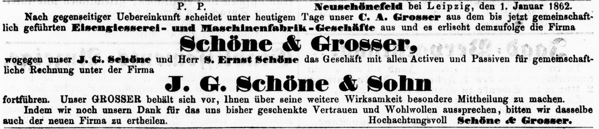 Ab dem Jahr 1862 schied Großer als Teilhaber aus und die Eisengießerei und Maschinenfabrik wurde unter der neuen Bezeichnung J.G. Schöne & Sohn weitergeführt. Laut Eintrag im Leipziger Handelsregister vom April 1862 wurden als Inhaber Johann Gottfried Schöne, Fabrikant in Großröhrsdorf und Samuel Ernst Schöne in Neuschönefeld eingetragen.