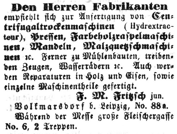 Um das Jahr 1850 gründete F.M. Fritzsch in Volkmarsdorf, Nr. 88a, eine Mühlen- und Maschinenbau-Werkstatt.