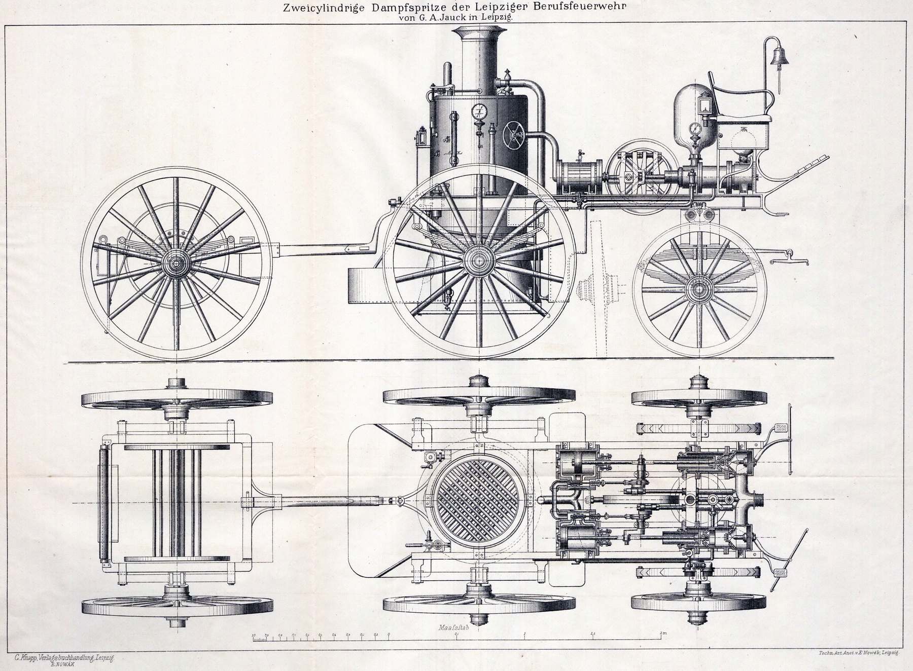 Zur Illustration, was man damals unter einer modernen Feuerwehr-Ausrüstung verstand, habe ich unten im linken Bild eine zweicyindrige Feuerwehr-Dampfspritze der Leipziger Firma Jauck eingefügt. [Quelle #5]