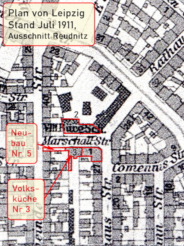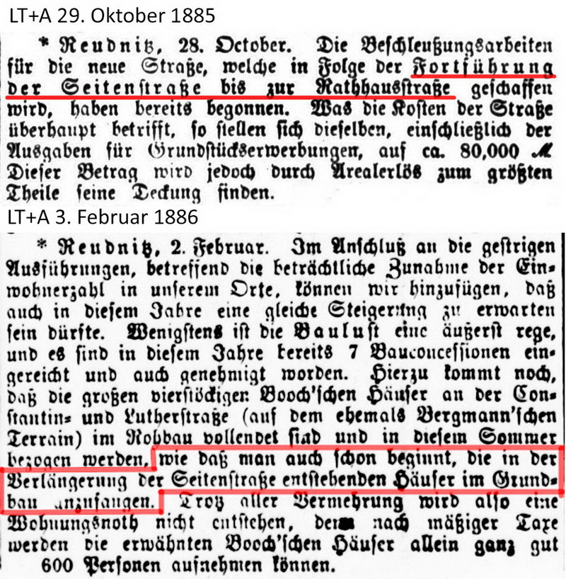 Dem Leipziger Tageblatt und Anzeiger (Bild oben rechts) habe ich entnommen, dass bereits im Oktober 1885 mit dem Bau der Beschleußungsarbeiten und Anfang Februar 1886 mit dem Bau der Gebäude begonnen wurde. Die neue Straße wurde am 9. Februar 1886 vom Verfassungsausschuß des Reudnitzer Gemeinderats als Marschallstraße benannt.