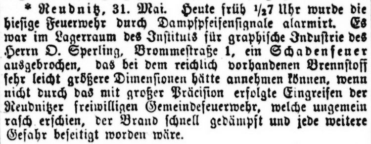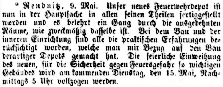 *Reudnitz, 16. Mai. Am gestrigen Nachmittag wurde, begünstigt vom prächtigsten Maiwetter, die Einweihung des neuen Feuerwehrdepots unserer Gemeinde vollzogen. An der Feier nahmen Theil der Amtshauptmann Herr Geheimer Regierungsrath Dr. Platzmann, ferner als Vertreter der Stadt Leipzig Herr Stadtrath Dr. Schmid, Herr Gemeindevorstand Größel, Mitglieder unseres Gemeinderathes, zahlreiche eingeladene Gäste, die Feuerwehr hierselbst und aus den umliegenden Ortschaften, Abgeordnete des sächsischen Feuerwehrverbandes, die Vertreter der Presse u.s.w.