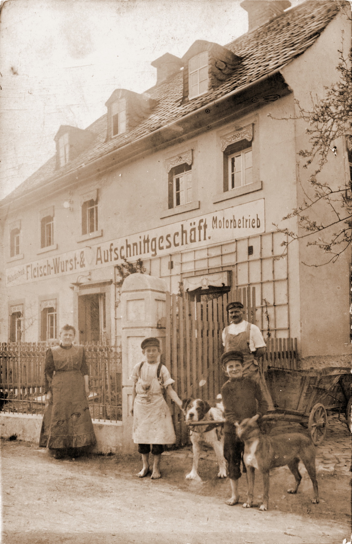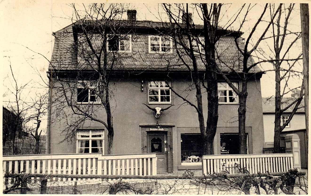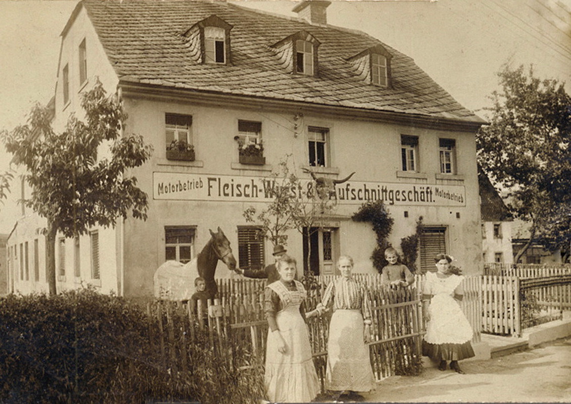 Auf dem Bild links, vermutlich aus dem Jahr 1912, sind links der ältere Sohn Herbert (neben dem Pferd) mit seinem Vater Franz und davor links im Vordergrund Tante Rosa zu sehen. Hinter dem Zaun, als zweiter von rechts, steht der jüngere Sohn Hellmut. Beachtenswert ist über dem Hauseingang der große Stierkopf mit Hörnern.