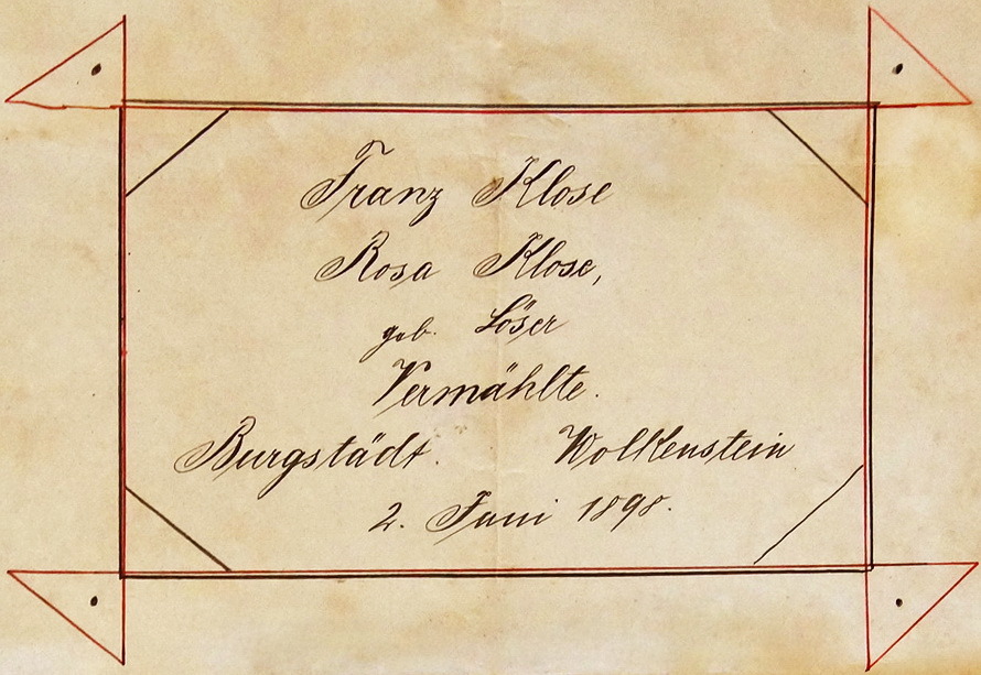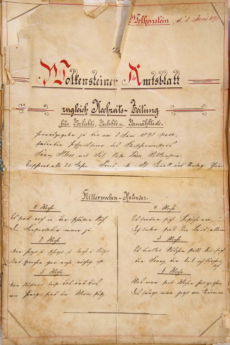 Franz Klose aus Burgstädt (nordwestlich von Chemnitz) stammend und Rosa Löser aus Wolkenstein im Erzgebirge haben im Juni 1898 in Wolkenstein geheiratet. Die Hochzeit hat damals sicher in der St. Bartholomäus-Kirche in Wolkenstein stattgefunden. Von der Hochzeitsfeier liegt mir die Kopie einer handgeschriebenen Hochzeit-Zeitung vor, siehe nachfolgende Auszüge: