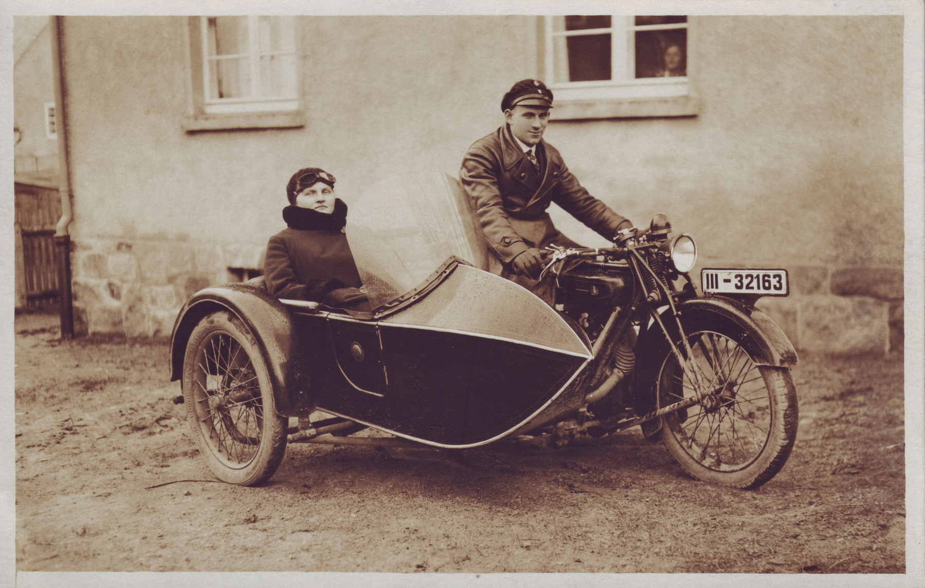 Hier folgend noch zwei Beispiele: links ein flottes Bild mit einem sportlichen Motorrad mit Beiwagen, gelenkt vom Hellmut und mit seiner Braut Grete im Beiwagen. Ich vermute aus dem Jahr 1929. Leider konnte ich zu Hersteller, Typ, Motor und Baujahr bisher nichts ermitteln – vielleicht kann mir da jemand weiterhelfen?