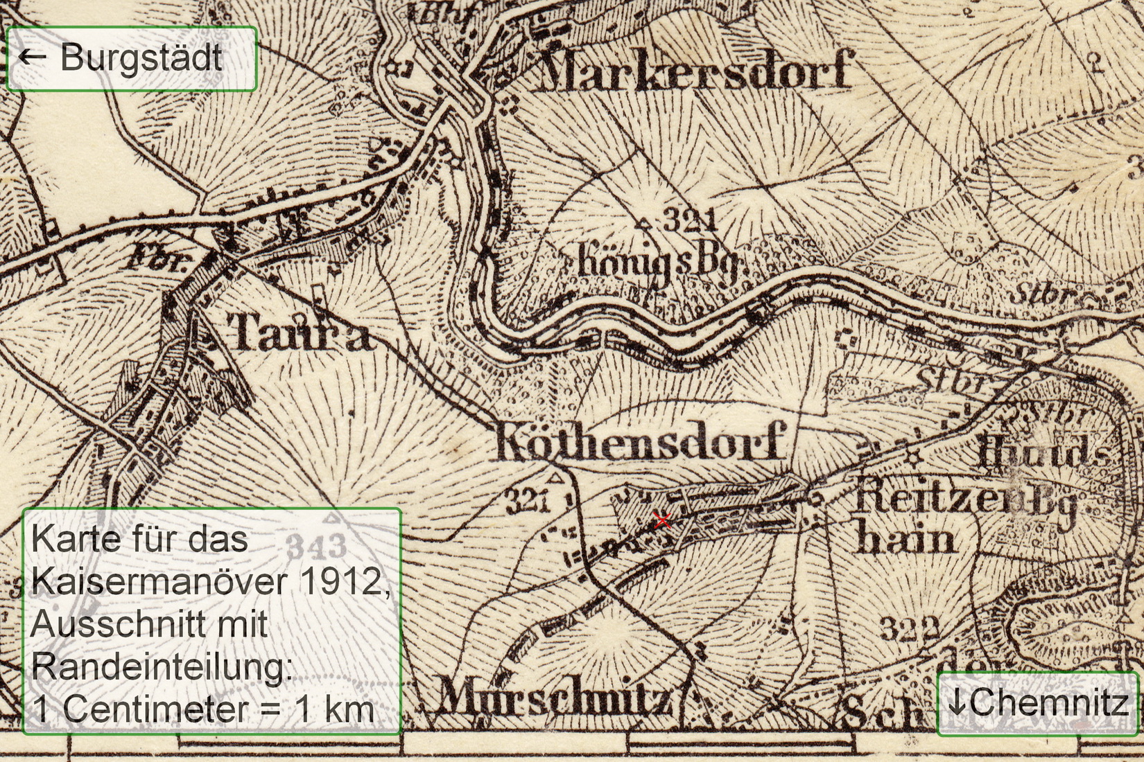 Auf der untenstehenden Karte aus dem Jahr 1912 ist ersichtlich, dass Köthensdorf nur reichlich 5 km von Burgstädt entfernt lag, also gleich um die Ecke, wie man so sagt. Das Haus Nr. 11 in Köthensdorf, später Köthensdorf -Reitzenhain, war ein zweigeschossiges Landfleischerei-Gebäude mit ausgebauter Dachetage. Die Lage dieses Hauses habe ich hier auf der Karte mit einem roten Kreuz gekennzeichnet.