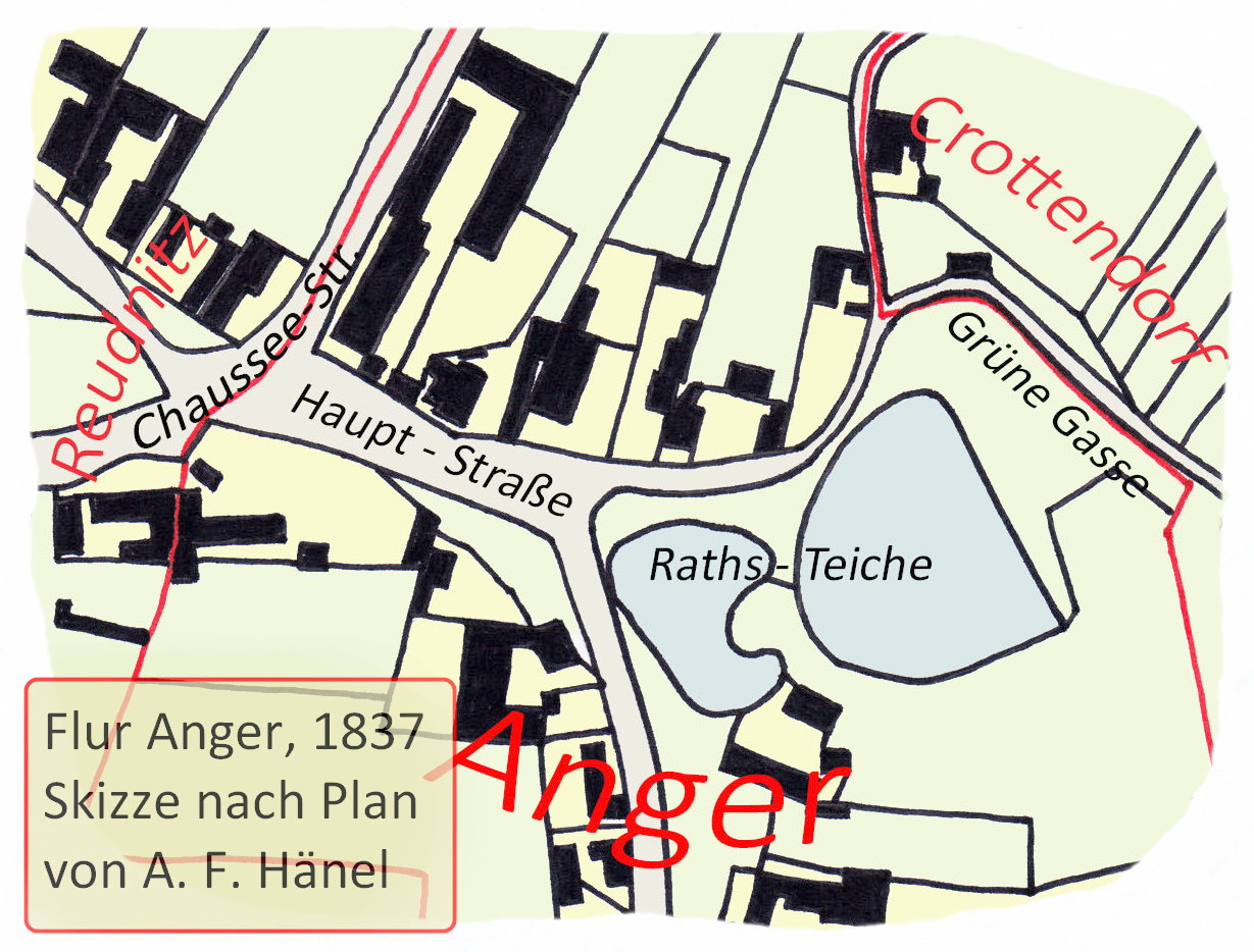 Zuerst zum zweiten Punkt – wo lagen eigentlich der bzw. die Rathsteiche im früheren Dorf Anger? Dazu habe ich hier eine Skizze und einen aktuellen Kartenauszug aus OpenStreetMap angefügt. Links eine Skizze vom nördlichen Teil der Flur Anger aus dem Jahr 1837, aus dem die Lage der beiden Ratsteiche ersichtlich wird: links der kleine und rechts der große Raths-Teich.