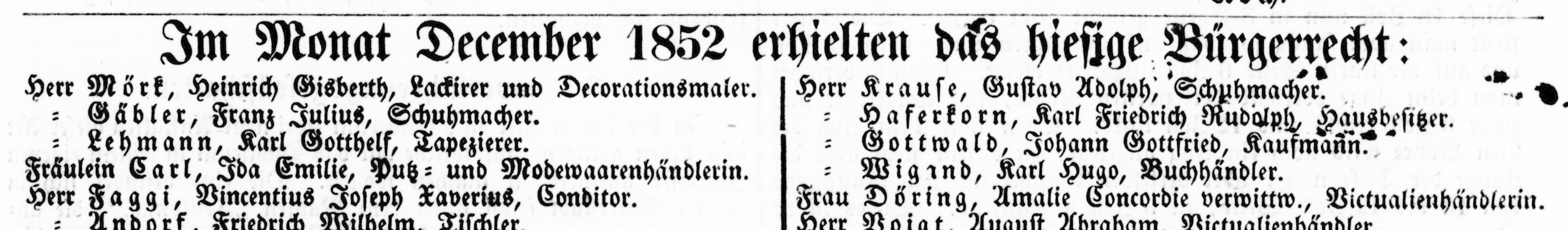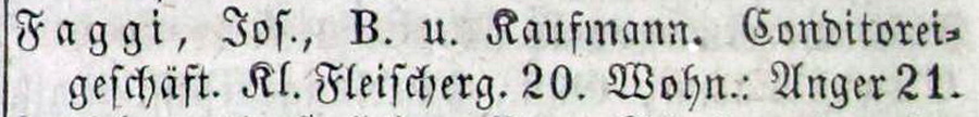 Aus dem Leipziger Tageblatt konnte ich ermitteln, dass Herr Joseph Vincenz Xaverius Faggi im Dezember 1852 das Leipziger Bürgerrecht erworben hatte. Laut einer Bekanntmachung in der Leipziger Zeitung vom April 1853 wurde unter neuentstandene Firmen auch sein „Conditoreiwaaren- u. Zuckerbäckereigeschäft“ erstmals erwähnt. Im Leipziger Adressbuch (LAB) erfolgte eine erste Erwähnung in der Ausgabe auf das Jahr 1854 und weiter bis letztmalig in der Ausgabe 1856.