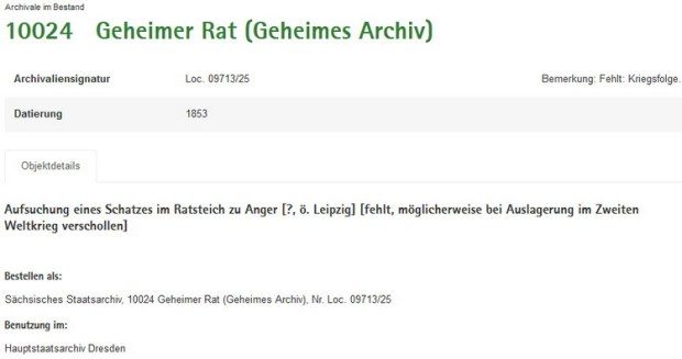 Und – was soll ich sagen – dort gibt es eine (nicht geheime) Akte zu einem Vorgang „Joseph Vincenz Xaverius gegen den Gutsbesitzer Friedrich Wilhelm Winter wegen Aufsuchung eines s.g. Schatzes im kleinen Rathsteiche in Anger“ aus dem Jahr 1853(!!!). [Quelle #2]