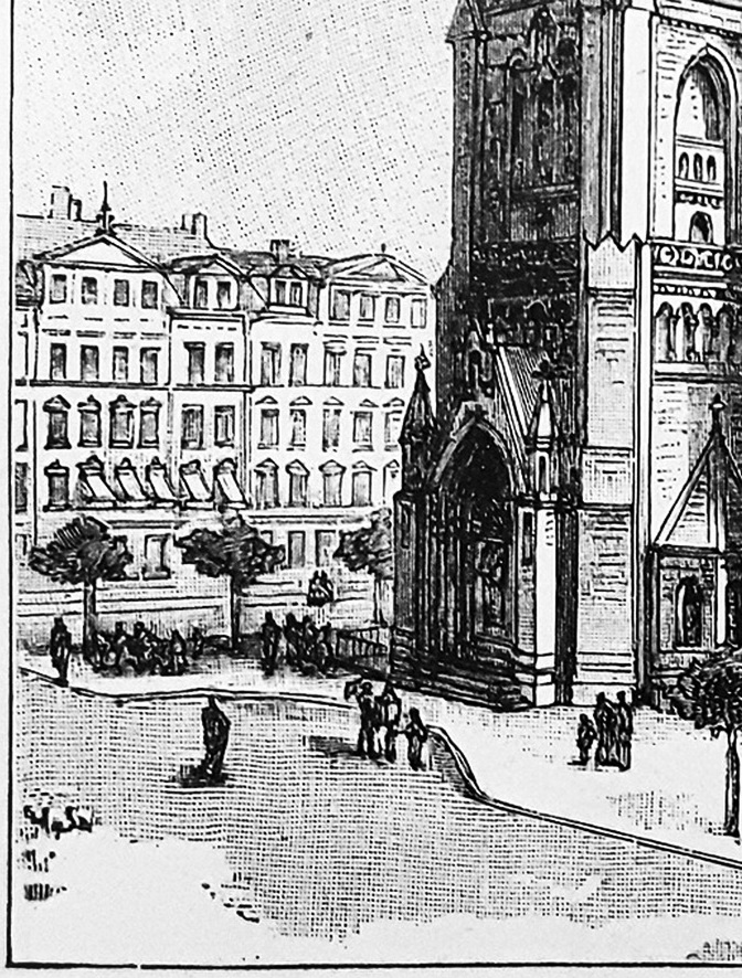 Ab dem Jahr 1876 gab es aber erste Bestrebungen, den großen Platz durch eine neue Straße zu teilen und die östliche Teilfläche zu bebauen. Auf der Skizze habe ich den Verlauf der neuen, noch unbenannten Straße, gestrichelt eingezeichnet.