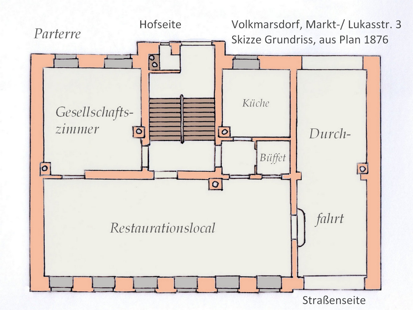 Das Restaurationslocal im Parterre des Hauses wurde vom Gastwirth Hermann Natho betrieben, der ab dem Jahr 1890 bis 1896 auch Hausbesitzer wurde. Aus der folgenden Skizze des Parterre-Grundrisses des Gebäudes ist die Lage des Restaurants und dessen Zugang über die Haus-Durchfahrt zu erkennen. Anmerkung: im Jahr 1911 wurde der Zugang zum Restaurant vom Hausflur nach der Straßenseite verlegt [Quelle #2].