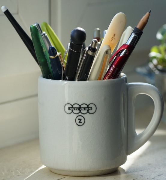 Heute soll es um die Geschichte einer Stiftdose gehen, hier rechts im Bild – eigentlich eine „Stift-Tasse”.